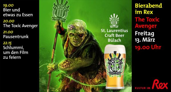 Zum zweiten Mal serviert uns der Verein "Bierabend mit Rolf" eine Auswahl von auserlesenen Bieren vom Zapf. Dazu gibt es etwas Kleines zu essen (im Preis inbegriffen). Programm 19.00 Bier und etwas zu Essen 20.00 Good Luck, Have Fun 21.15 Pausentrunk 21.30 Dont't Die 22.30 Schlummi, um den Film zu feiern Verein Bierabend mit Rolf: www.bierkultur.ch |